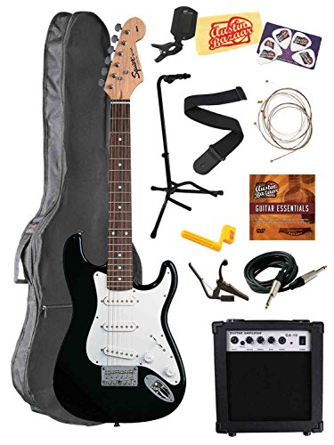 - Contains Squier by Fender Mini Strat Electric Guitar, Gearlux 10-Watt amp, Gig bag, Guitar stand, Instrument cable, Strings, Strap, Capo, Tuner, Picks, Stringwinder, and Polishing Cloth
